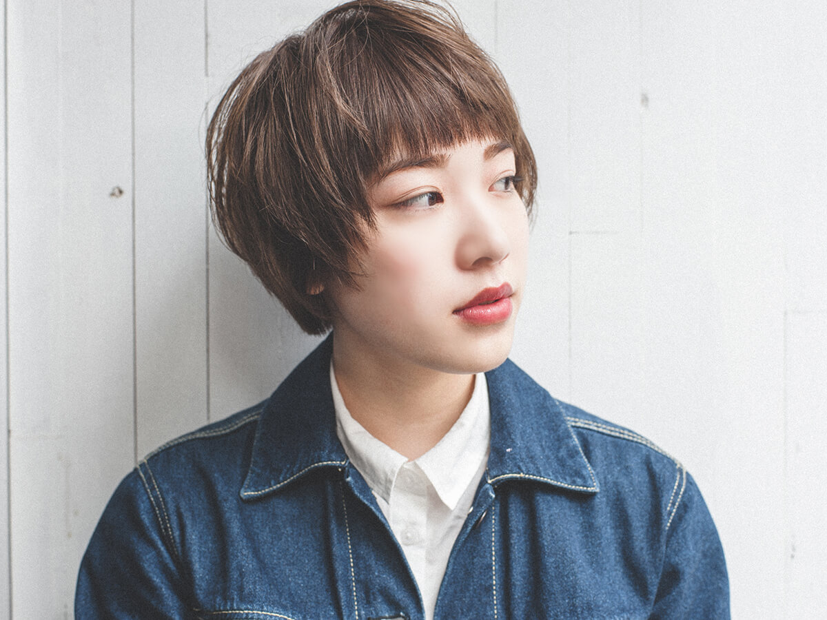 顔周りは前上りに切り込んだマッシュショートスタイル。赤味をおさえたカラーは髪の毛にやわらかさをプラスさせる。軽さを出したカットで束感を出しやすくしたらウェットスタイリングで仕上げる。